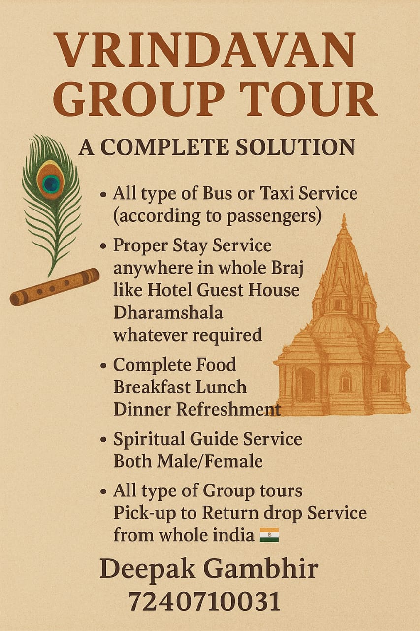 Radhe Radhe, my name is Deepak Gambhir, I was born in Shri Braj Dham Kamvan, India. Vrindavan is considered one of the holiest places in India, as it was the site where lord Krishna spent his childhood days. Being from a Gambhir family, Vedic literature, religious Ceremonios and spiritual guidence have been a part of Our lives for decades. I have a passion for travelling and have always found happiness and peace.